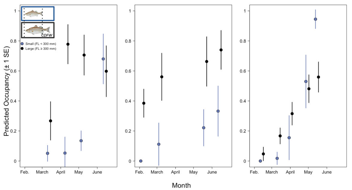 I also co-developed dynamic occupancy models for when small and large striped bass were on the Stanislaus River. Model predictions (y-axis) for both size groups are shown by sampling months (x-axis) for each study yearThe above graph links to a quick description of why this research matters.
