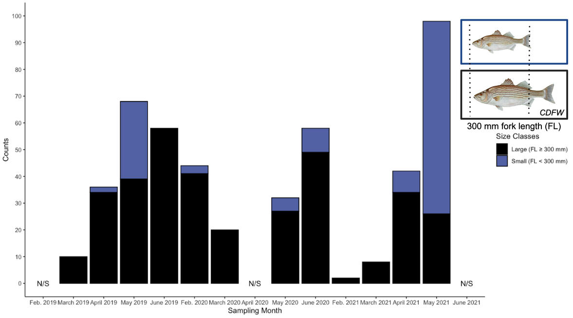 I worked with FISHBIO, Inc. to determine when two size groups of striped bass (Morone saxatilis) were on the Stanislaus River via the above bar plot, which shows the observed counts of all captured fish (y-axis) by sampling months (x-axis)The above graph links to my brief talk on how striped bass research supports diverse people.